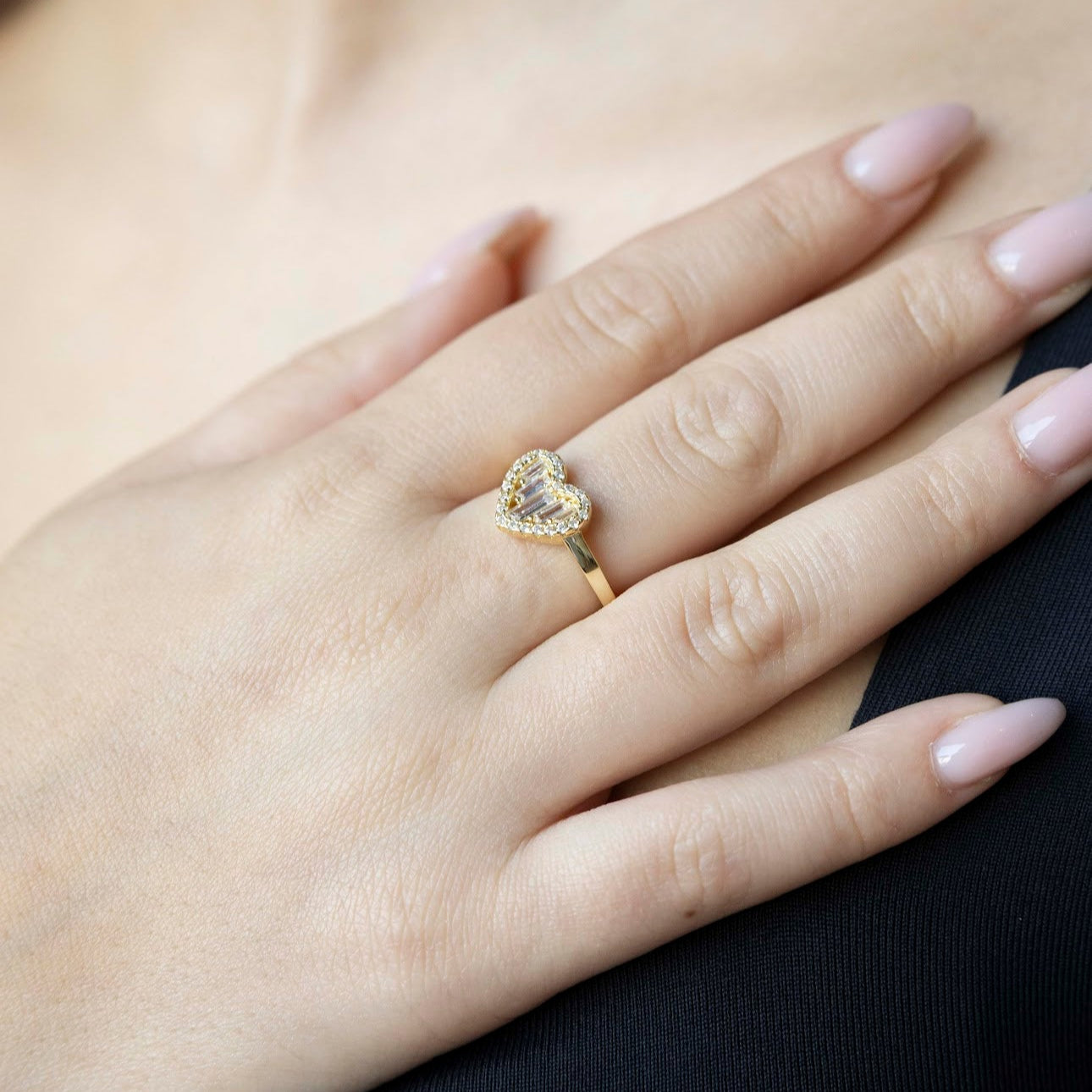 This dainty heart ring features sparkling CZ pave accents in your choice of rhodium or 14k gold vermeil, all over a solid 925 sterling silver base. Perfect for everyday wear or stacking with your favorite bands!