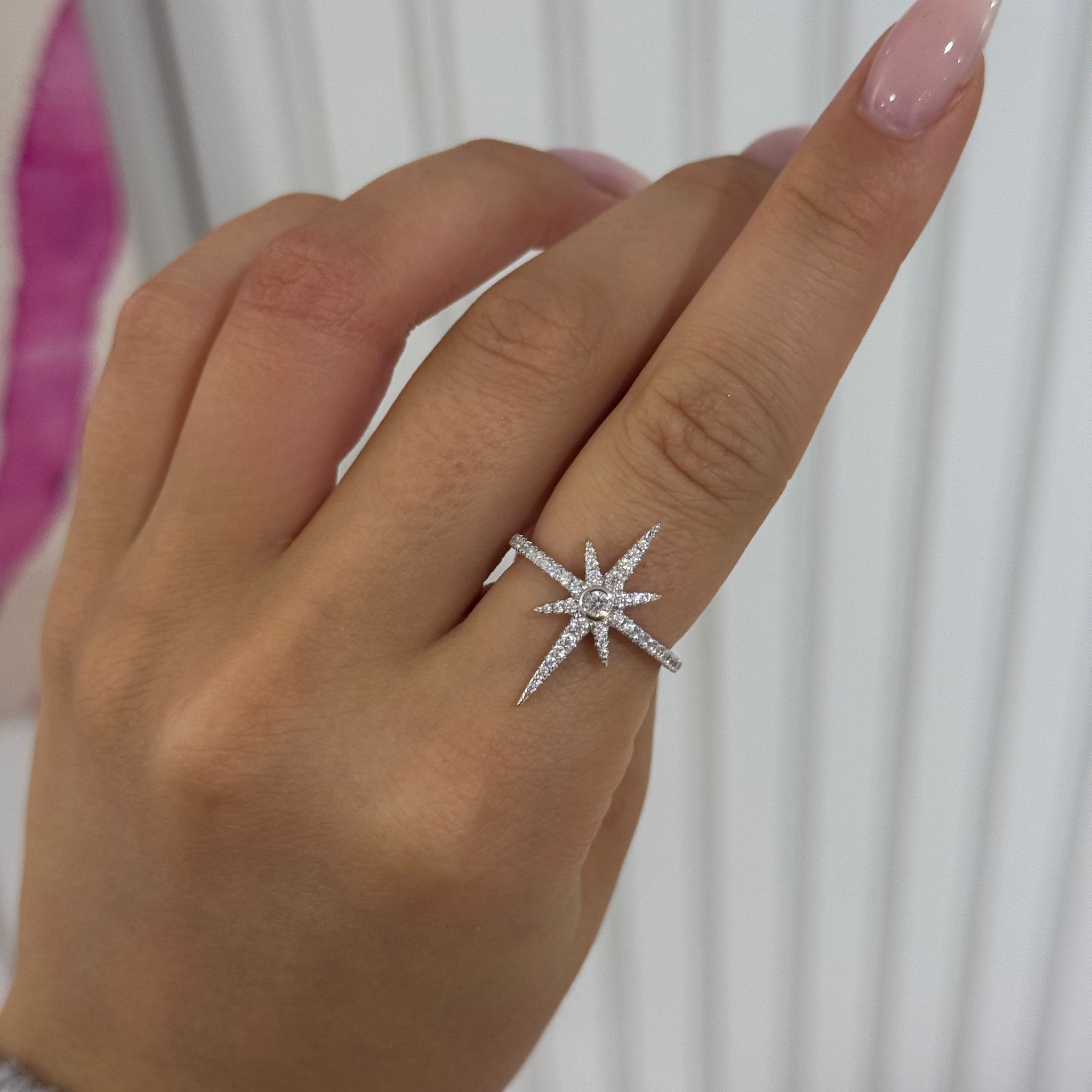 The Stella Ring is your golden reminder to shine bright. Featuring a starburst design encrusted in micro CZ stones and set on a delicate pavé band, this ring gives radiant, night-sky energy from every angle.